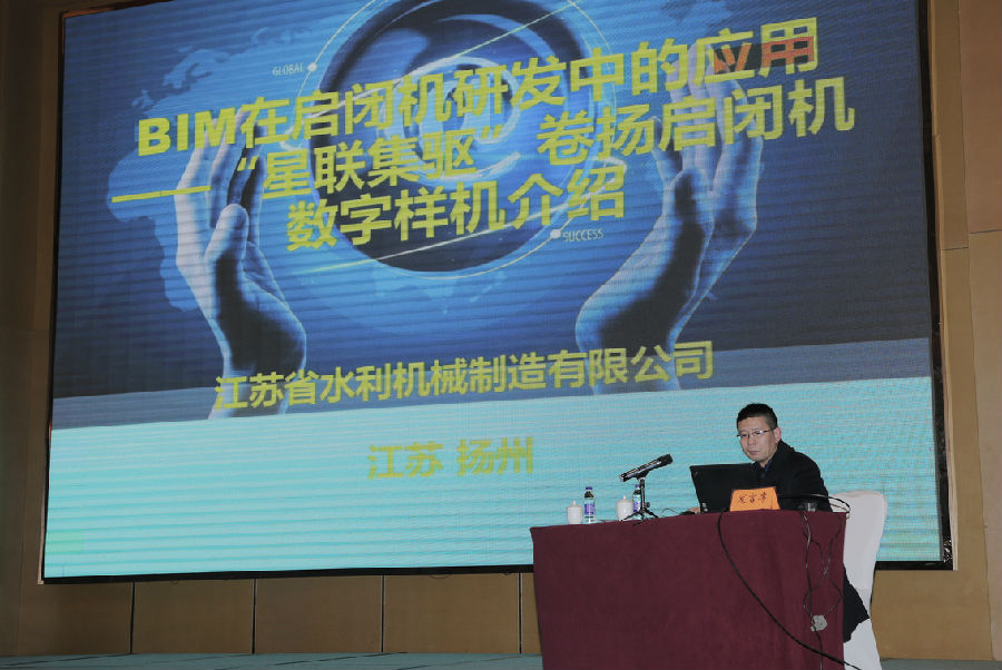學術交流由水口專委會副主任委員羅文強和熊紹鈞主持,江蘇省水利機械制造有限公司王波作了《BIM在啟閉機研發中的應用——“星聯集驅”卷揚啟閉機數字樣機介紹》報告。