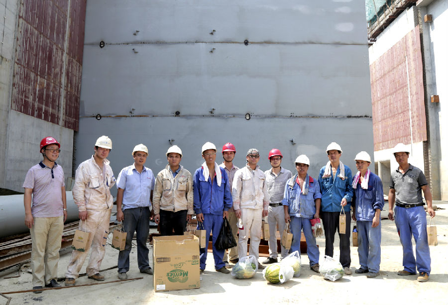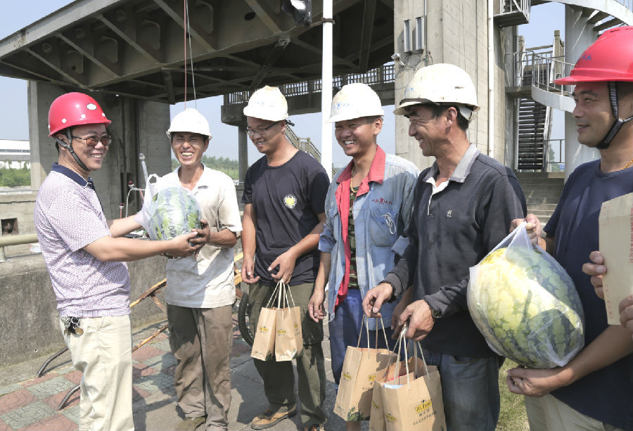 7月25日,水機公司黨委書記田建京、工會主席黃統及相關項目負責人一行8人前往芒稻閘、邵仙閘項目施工現場開展 “送清涼”活動,慰問戰斗在高溫酷暑下的一線員工,送去防暑降溫用品、西瓜和慰問金,囑托現場員工注意施工安全,合理調整作息時間,采取必要的防暑降溫措施,團結一心,攻堅克難,確保優質高效地完成項目施工任務。