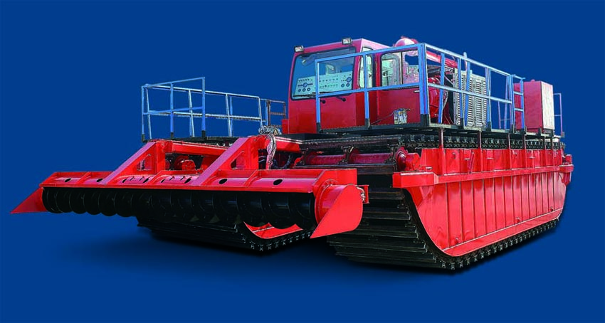 XWQY100型兩棲旋挖式清淤機(jī)是應(yīng)用戶要求而專門設(shè)計的一種大型池塘水下清淤機(jī)械。該機(jī)以浮箱履帶為基礎(chǔ)實施工作移位,用旋挖頭切割和收集水下淤泥,用泥漿泵將泥漿吸走并排出,送到指定的排泥場,從而實現(xiàn)對大型池塘清淤的目的。 該機(jī)也可用于其他具有相似條件的河道、溝渠等淺水水域進(jìn)行清淤作業(yè)。